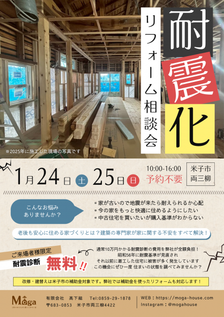 このたび耐震化リフォーム相談会を1月24日(土)25日(土)開催する事に致しました。