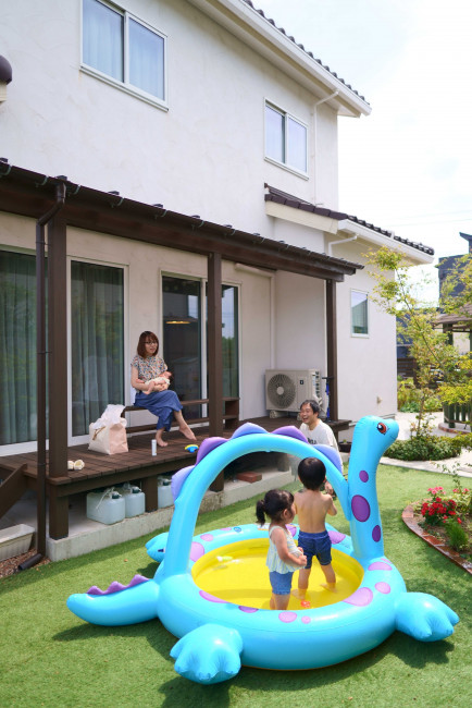 庭には雑草対策として人工芝を使うのもおすすめです。夏になったらプールを出して遊ぶこともできますよ🤗子どもは大喜び間違いなしです!