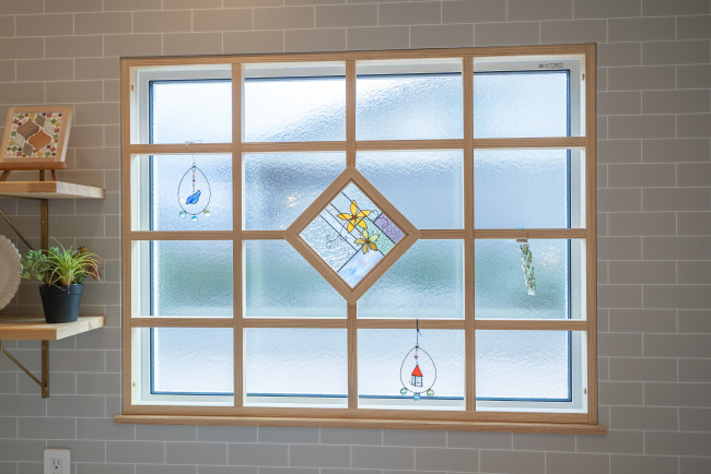 菱形模様の格子の中に、弊社のステンドグラス教室で制作されたステンドパネルを入れるといったデザインは「こんなの見たことない!」との声も多く、Mogaハウスを代表したデザインとして人気です♪