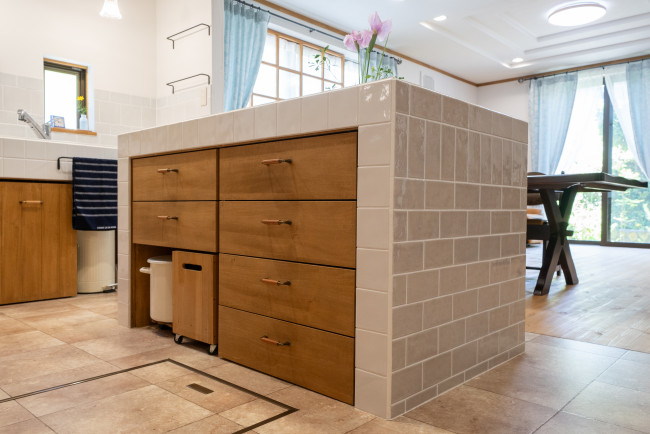 タイル天板の作業台はデザイン性だけでなく、機能性も抜群です!熱い鍋を置いても焦げ付く心配がなく、食材をこぼしてもさっと拭き取れるので、お手入れも簡単です。