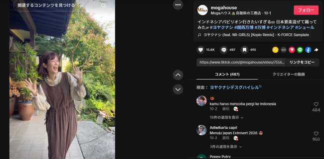 以前、大阪万博のインドネシア館で使用された音楽を使った動画を投稿したところ、それが予想以上に反響を呼び、一気にインドネシアの方のフォロワーが増え、20人くらいのフォロワーが2か月で1200人になりました!