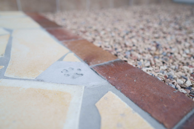 「たくさん使ったタイル、犬が遊べる庭、犬の足跡をつけた玄関、すべてお気に入りです。」